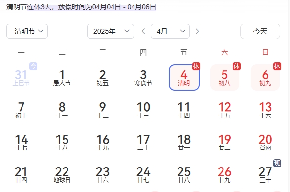 根據(jù)國家2025年春節(jié)放假通知并結(jié)合本司實(shí)際情況,放假做以下調(diào)整:1、放假時間:2025年4月4日至2025年4月6號,共3天,3月7號正常上···